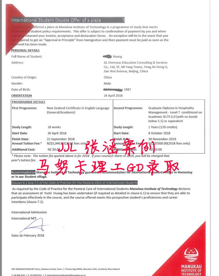 录取结果:马努卡理工学院GD条件录取