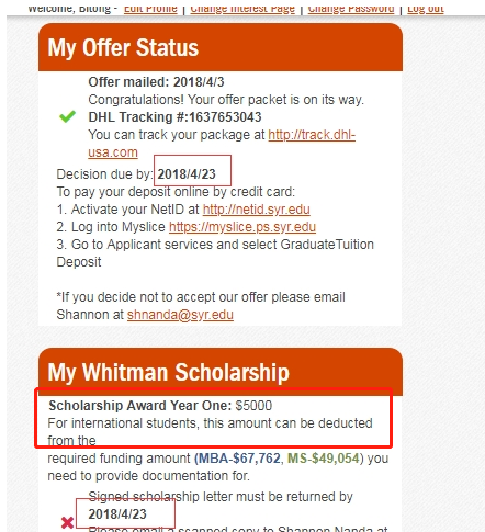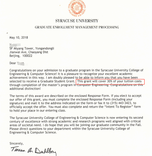与安同学和韩同学相比,李同学的奖学金来的更是大快人心。李同学来自哈尔滨市一所211高校,计算机专业,由于在校平均分只有75/100,如果要拿到心仪的院校的录取,我们需要在其他方面多做努力,通过学习,李同学托福刷到104分(其中有一次101分的托福成绩,听力满分),GRE315分,同时为了弥补专业课方面的不足,李同学在我的指导下参与了Coursera 在线课程,学习杜克大学的Java 编程和软件工程基础,完成一部分课就会得到一份证书,我们会第一时间补交给学校。 由于Coursera 课程大多都是纯英文授课,没有中文翻译,所以拿到证书并不是一件容易事,我们的目标申请院校对证书的认可度自然也很高。上述申请条件,搭配合适的文书,最终李同学拿到了美国综合排名61,专业排名68位的雪城大学录取通知书,并获得35%学费减免的奖学金,共计人民币95688元。