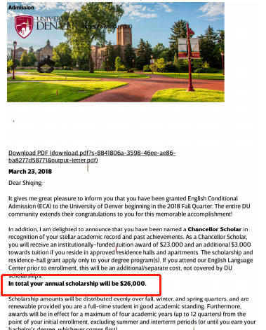 上述几个学生的案例是硕士学位的申请,在2018入学季的学生中,申请本科新生的李同学最终选择丹佛大学,获得了每年26000美金的奖学金,四年下来折合成人民币是660400人民币。吴同学申请本科转学,获得了美国综合排名46位的迈阿密大学的录取,并且获得了每年15000美金的奖学金,最多可以给到三年,折合人民币是近29万。