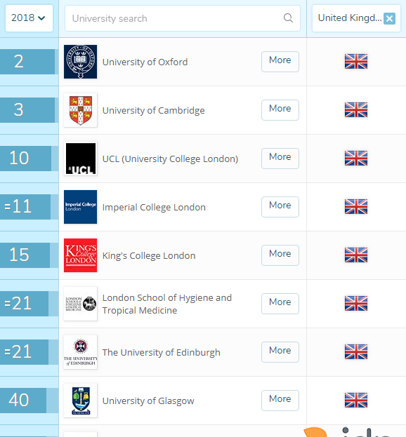 既然作为欧洲医疗届的领头羊,英国在此次QS2018世界大学医学院TOP10排名中,表现十分强势。英国大学牛津大学,剑桥大学分别挤进世界第二和第三,其中,英国伦敦大学学院位列世界第十。接下来,大家随小编一起来看一下,挤进QS2018世界大学医学院TOP100的院校,都有哪些吧!
