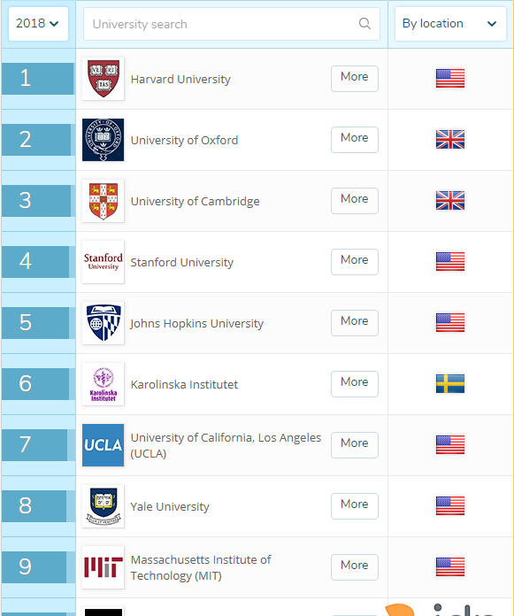 QS2018世界大学医学院TOP20排名 哈佛蝉联第一