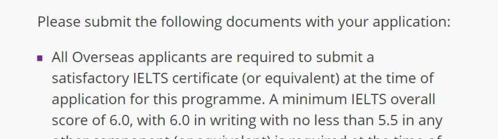 申请的时候必须带总分6.0,写作不低于6.0,其他单项不低于5.5的雅思成绩。