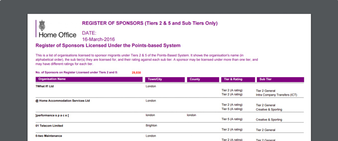 这时候你需要的信息就全部都有了。我们看文件开头红字部分,能提供T2和T5的企业一共有29830个,想一想也是不少的嘛!但事情并没有那么简单,我们接着看。下面表格中的第一列是公司的名字,第二和第三列是公司所在地,再接下来一列就是公司提供的签证类型和评级了,最后一列是对签证的解释,一般你看到Tier 2 General就可以了(如上图)。不知道小伙伴们注意到没有,确实有一些公司是不提供Tier 2 General的,而提供T5签证的大部分公司都是针对创新和体育行业,或者是宗教工作者,真正针对普通的实习生是少之又少。
