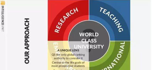 今年的QS排名包括了自全球的85个国家、1011所大学,排名指标依据分为四大评估标准和六大衡量标准: