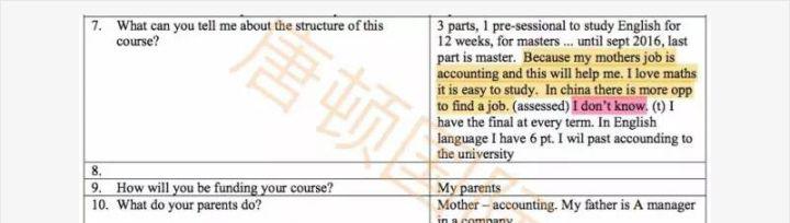 第7个问题是问课程结构,学生把结构说了一半,突然开始说自己选择这个课程的原因。逻辑混乱,之后还出现了“我不知道”这样的回答,是令签证官不能接受的。