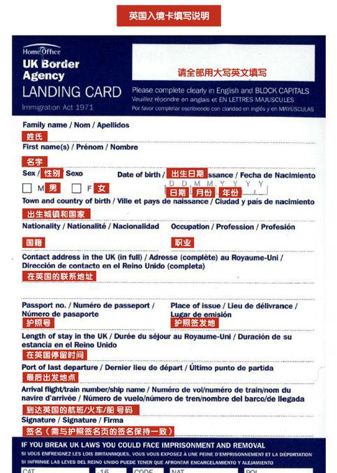无论是来英国留学还是旅游观光,在飞往英国的飞机上乘务员都会发放一张蓝色的卡片,上面写着UK Border Agency Landing Card,这个就是英国入境卡,凡是非欧洲经济区(EEA)的国家公民进入英国前都需要填写入境卡。这个入境卡就是过海关用的,飞机快降落的时候就会发这张卡了,如果填错了也没关系,下飞机后咱们从“non-EU”通道走的时候还能看见专门填写入境卡的地方,可以再拿一张填写。入关的时候把你填好的卡片和护照一起交给海关工作人员就行啦。下面这张图片就是入境卡的样子,接下来就从上到下教大家该如何填写入境卡。