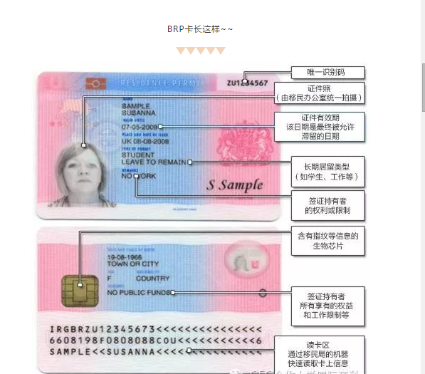 所有申请Tier 4签证在英国学习超过六个月的学生,会获得一个有效期为30天的入境签证,抵达英国后需在10日内到指定邮局领取生物信息卡(Biometric Residence Permit)。 BRP卡上包括姓名、出生地、出生日期、指纹、照片、移民信息(允许居留的时长),以及能否使用英国的社会公共福利和医疗。其实可以把这张卡看作在英国的身份证。因此BRP卡非常重要,要注意保管好哟!