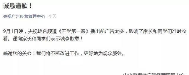 之后,央视广告经营管理中心公开文致歉:《开学第一课》播出前广告太多,影响了家长和同学们准时收看。谨向家长和同学们表示诚挚歉意!感谢您的关心!我们将不断改进工作,更好地为观众服务。