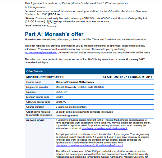 好在学生本科数学成绩很好,而金融数学属于难度较高、录取分相比商学院更低的科学学院。于是给学生拟设了:金融数学、应用金融学以及应用数学(金融方向)的三个志愿。并给学生选定了:新南威尔士大学、莫纳什大学,两所所综合排名高,而金融数学专业强的澳洲名校。