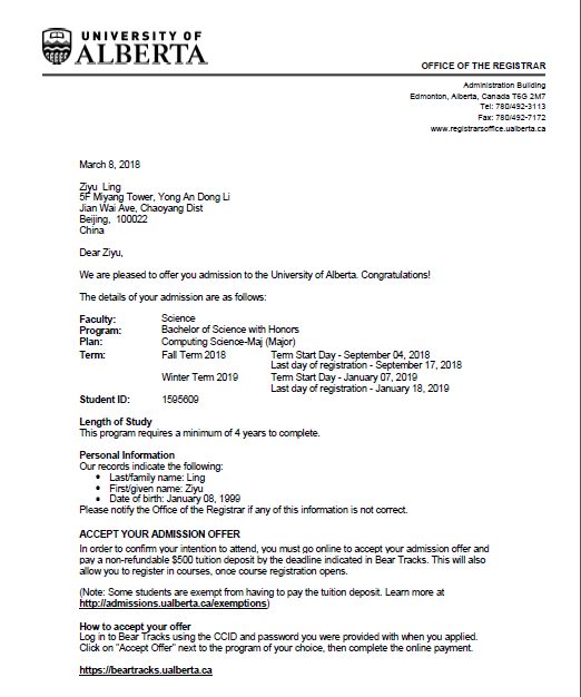 为了避免影响学生后期的学习状态,我们在高二下半学期就把所有需要准备的材料已经大致准备好,剩下的时间全部用来提高平均成绩和雅思,最终我们以平均分91分,雅思6.5的成绩申请到阿尔伯塔大学计算机科学的本科。