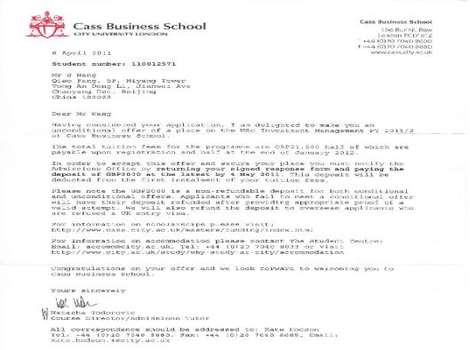 录取大学:伦敦城市大学CASS商学院