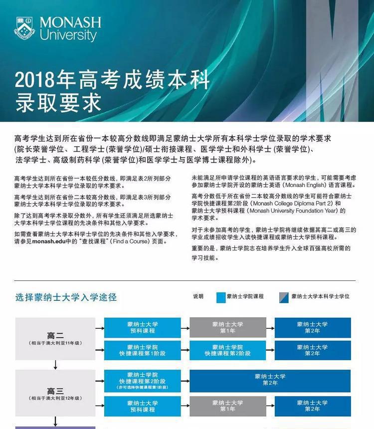 除了达到高考学术录取分数外,所有学生还须满足所选蒙纳士大学本科学士学位课程的先决条件和其他入学要求。