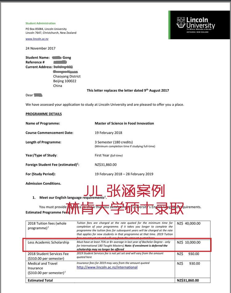 ---申请中遇到的问题:学生给予的申请时间较短,前后只有2个月时间。从学校申请到签证办理,对于硕士申请非常紧张。通过与林肯大学校代老师积极沟通中,一直也在帮学生跟催offer,使得学生在2周内就拿到了条件录取通知书,同时,因为学生成绩好,也获得了1万纽币的奖学金。在学生获签后,又遇到了另一个问题,林肯大学主课报到的时候,是需要持成绩单、学位证和毕业证的公证件,但学生准备行李中忘记了。最终在校代老师从国内飞往新西兰时帮学生把公证材料带了过去。