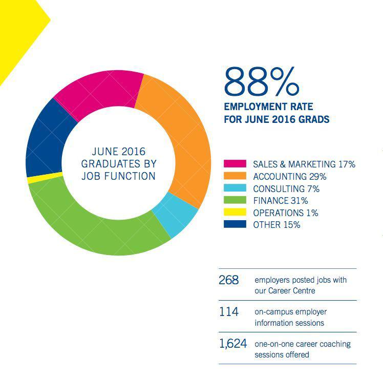 最后我们从毕业后职业方向看看:以下是洛特曼商学院官方给出的数据:88%毕业生可以顺利找到工作,其中从事Finance行业的及Accounting 行业的人数最多,分别占31%和29%。 大部分学习Finance的同学就业方向会倾向于银行,债券,金融机构等领域。我们所说的高大上的投行就是finance的人梦寐以求的职业。当然所有的付出和回报都是成正比的,要想进入投行,必须付出比常人多的努力。很多人在学完rotman专业的大四之后会开始考虑取得注册金融分析师证(CFA)。CFA的取得需要三次level的考试以及一定的工作经验要求,所有是一个很长期而且艰辛的过程,所以最后的含金量也非常大。 学习Accounting的小伙伴们在大三大四就会比较辛苦一点。会计学完之后的就业方向大部分人会倾向于四大会计师事务,也就是我们常说的BIG 4。另外的选择还有其他银行或者大型企业内部的CPA program,非常适合于那些决定好最终想要取得注册会计师证(CPA)的小伙伴们。 学习Management的同学往往会进入公司的管理层或是Marketing; Consulting类型的工作。也有同学毕业之后选择接管家族企业或者与一群志同道合的有志青年成就一番事业。