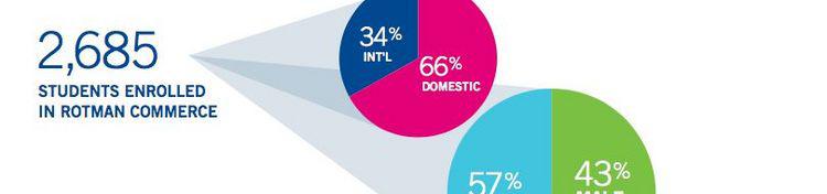 让我们先来看看招生数据:2017年度一共有2685名学生进入Rotman Commerce Program, 其中国际生占34%,本地学生占66%。男女比例基本协调,其中女性57%,男性43%。大家可能会听说在Rotman上课,感觉办班上大多都是华人面孔,但其实很多都是native speaker哦。所以想要在商学院好好生存+社交,坚实的口语基础以及外放的性格需要各位不断加强~