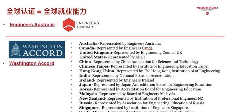 全球认证方面,西悉尼大学的工程课程更获得Washington Accord华盛顿协议的认证,在多个英美国家以及中国均获得工程师资格认证。