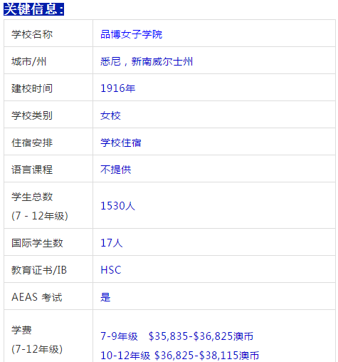 品博女子学院为非选拔性私立女校,坐落于二十公顷风景秀丽的悉尼上北岸,拥有优美的公园式校园环境。学院招收幼儿园至十二年级的女生,並为七年级以上的学生提供寄宿。