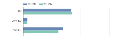 作为对比,英国大学在欧盟地区的招生情况如下: