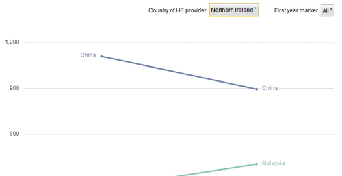 2012-13年度,有1110名中国留学生在北爱尔兰地区留学,到2016-17黏度,就只有895人了。作为参考,北爱地区的大学主要包括:贝尔法斯特女王大学(Queen’s University,Belfast)和奥斯特大学(University of Ulster)。
