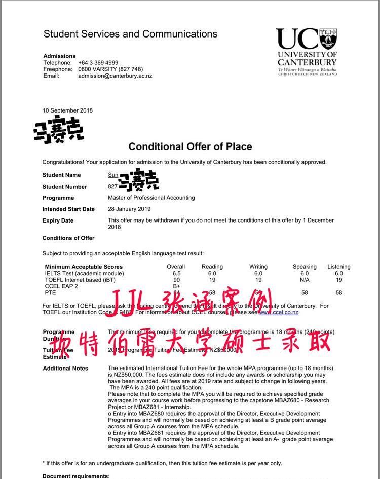 录取结果:坎特伯雷大学Master of Professional Accounting