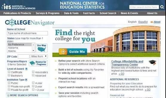 提供学校搜索,筛选项目有:标化成绩、录取率、学校类型、地理位置、住宿条件、专业、运动和活动、学分情况、费用、多元化水平、学校服务系统,属于比较详尽的介绍。