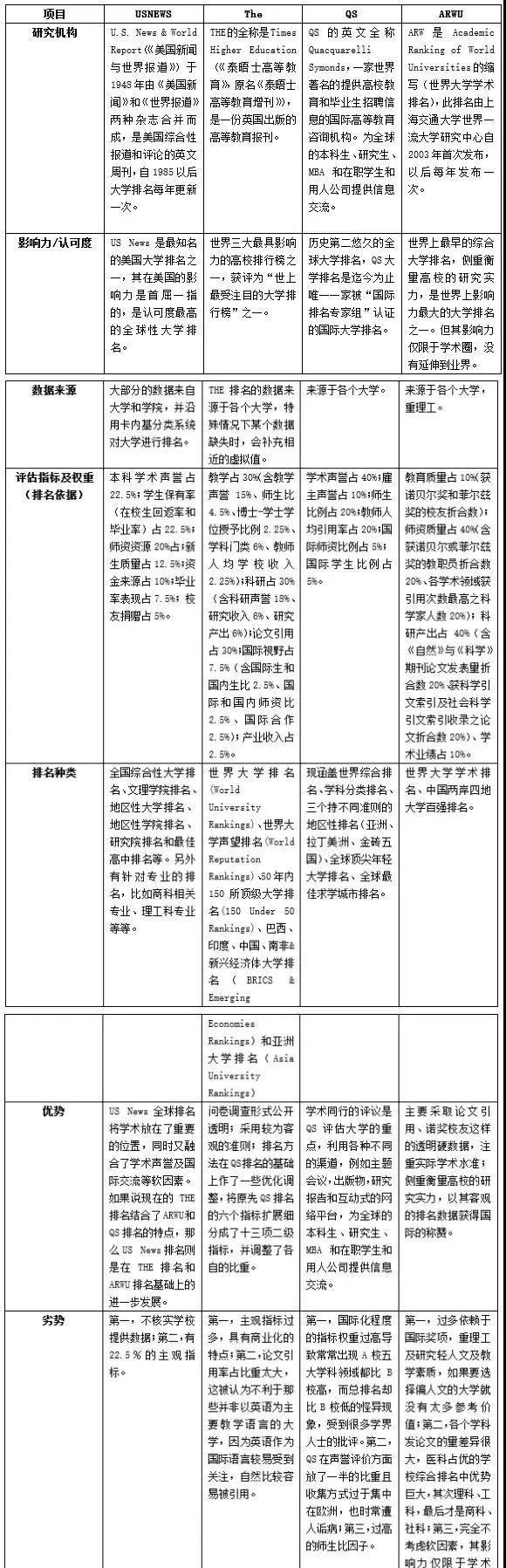 同样,排名也分为USNEWS、ARWU、THE、QS排名,在择校和这些大学排名之间,我们究竟应该相信哪个?下面简单介绍4种大学排名以及它们的侧重点,供大家在选校时参考。