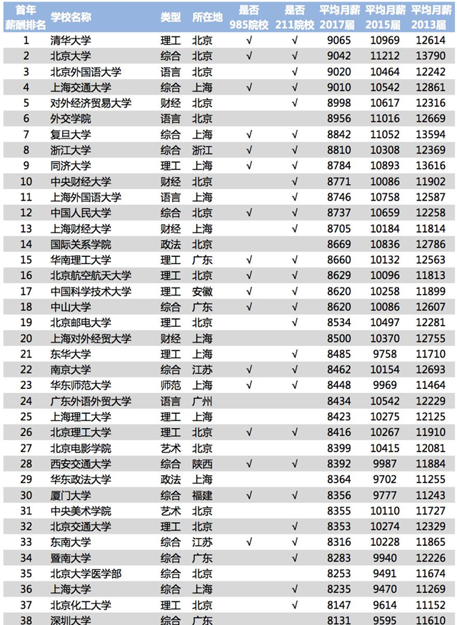 在前段时间发布的2018年中国大学毕业生薪酬排行榜中,985、211高校毕业生薪酬水平大幅度领先普通高校;清华大学2017届毕业生平均薪酬最高,达到9065元。排名靠前的大多是原985和211重点建设高校,普通高校毕业生薪酬水平差距较大。另外,从上榜高校所在城市来看,一线城市的高校在毕业生薪酬上明显占据优势。除浙江大学外,位居前十的高校均为北京和上海高校。从专业上看,理学和工学类专业薪酬水平较高;农学、法学和管理学较低,大多数专业平均薪酬不到3000元。