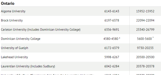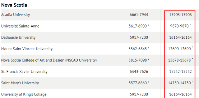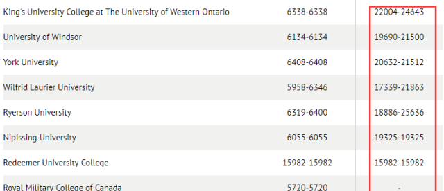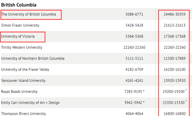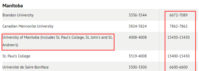 注意:,由各个学校的专业学费统计出的一个平均值,只是一个2016 – 2017大概数据,仅做参考….魁省没有数据来源..前面是本地学生学费,后面红色部分是留学生学费