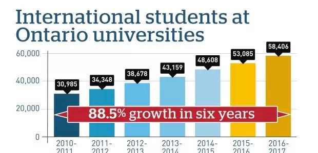 安省教育与发展部门提供的数据显示:自2010年开始,6年里安省大学的国际生人数增加了88.5%,本土学生录取仅增加7%。