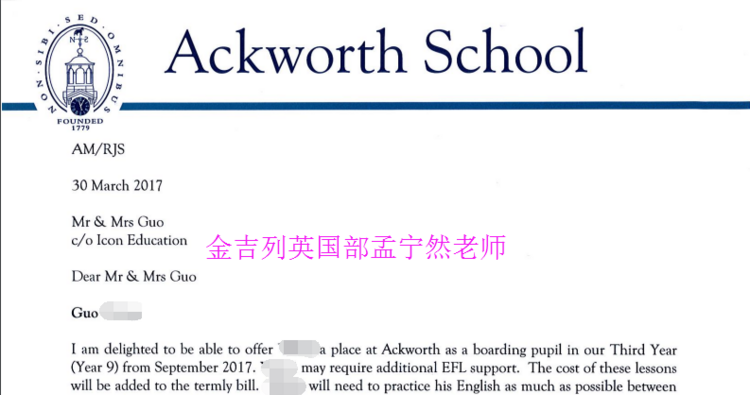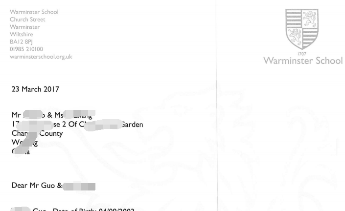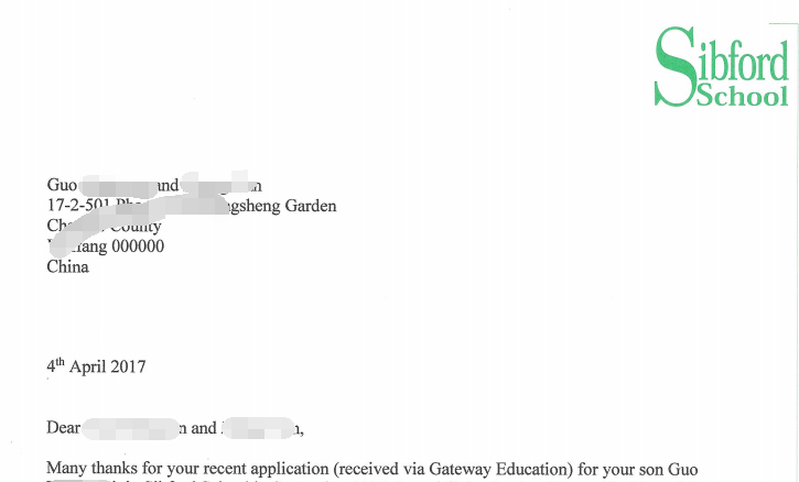 郭同学爸爸是通过朋友介绍在2016.12月份认识全球留学网老师的。虽然孩子在国内的初中成绩不是很理想,但是每个家长都是对孩子期望很高。在明确郭同学申请的目标院校后,全球留学网老师给学生介绍了申请的具体流程,并且为占好学校的名额,第一时间安排了给郭同学递交申请,并且缴纳了申请费,但是因为学生基础较差,为通过申请当中的笔试和面试,建议郭家长安排郭同学全封闭的有针对性的补学了一段时间的英语课程。与此同时,安排学生参加了2017.2月份公司组织的英国中学校长见面会,让郭同学一对一直接跟英国校长接触并且面试,提高录取成功率。