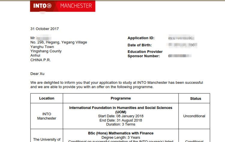 学生是2017,思维方式可能会更有帮助,学生自己也有一颗不安分的心想出去寻求自己更大的梦想,所以即使学生高考还不错但是依然选择了出国留学,因为在国内读的是普通高中所以去英国读本科需要先读英国的本科预科。因为学生是在高考出成绩之后才来找我,那时候已经比较晚了很多学校商科方向位置九月份的入学名额已经没有了,学生和家长的期望又比较高所以学生坚持申请了曼大和伯明翰一月份入学的本科预科。并最终拿到录取。