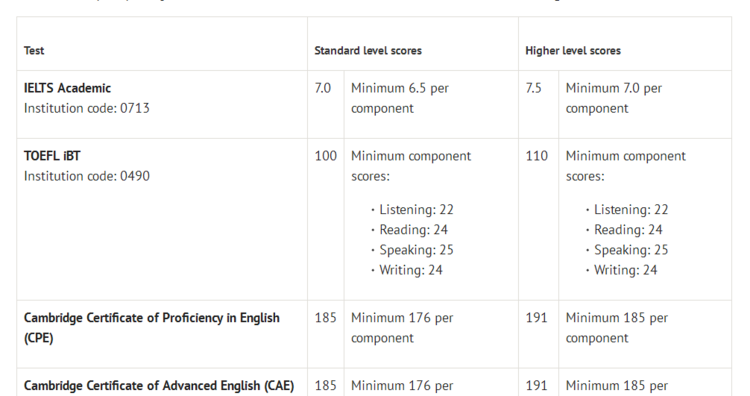 英语要求:IELTS、TOEFL(iBT)、CPE、CAE等成绩均可接受。具体要求如下: