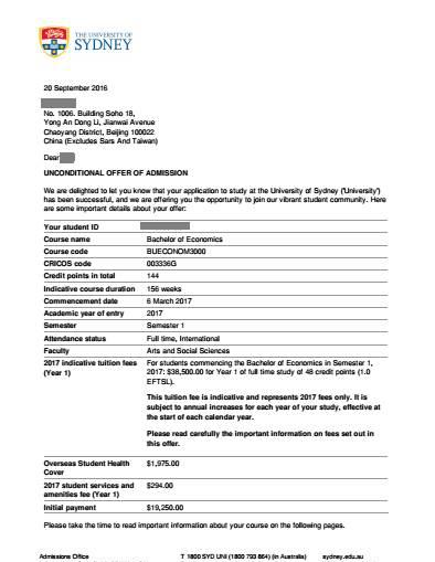录取结果:悉尼大学