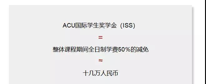 为了向学习优异的留学生提供更好的经济支持,ACU设立了只针对留学生的ISS奖学金,获得ISS意味着在ACU就读期间所有课程的学费减免50%。但是!这么丰厚的奖励竞争自然也很激烈,因此ISS每年最多只能颁发给20名国际学生