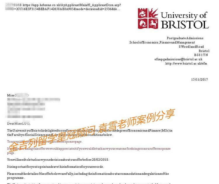 L同学,首都经贸大学经济学专业 83分,在全球留学网老师的连续几日废寝忘食的为学生修改,完善申请资料,成功递交后,最终拿到了世界排名30位的布里斯托大学的学术无条件的offer,学生喜极而泣,全家都很感谢全球留学网老师为学生圆梦。