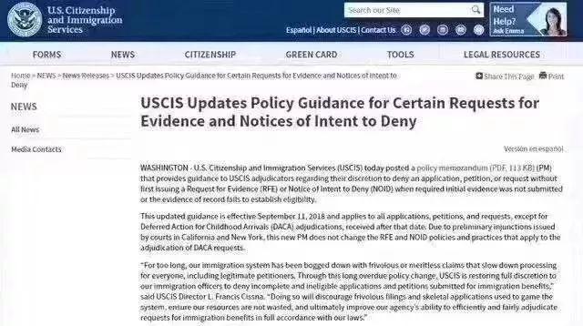 新规:2018年9月11日起,美国移民局收到的所有移民/非移民申请,以及身份转换请求,如果一开始提供的材料不符合要求,或者没有提交全部的证明文件,移民官可以直接拒绝,不用事先寄发补件(RFE)或否决意向(NOID)通知书。