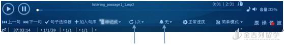 接下来,进入分句精听,也就是听写的主要过程。我们需要对主界面进行一些按钮的调整。句子重复调整到5遍,句子间隔调整到10—15秒(主要看个人书写句子的速度,依个人情况而定,一般笔者是调整到10秒)。调整后如图:
