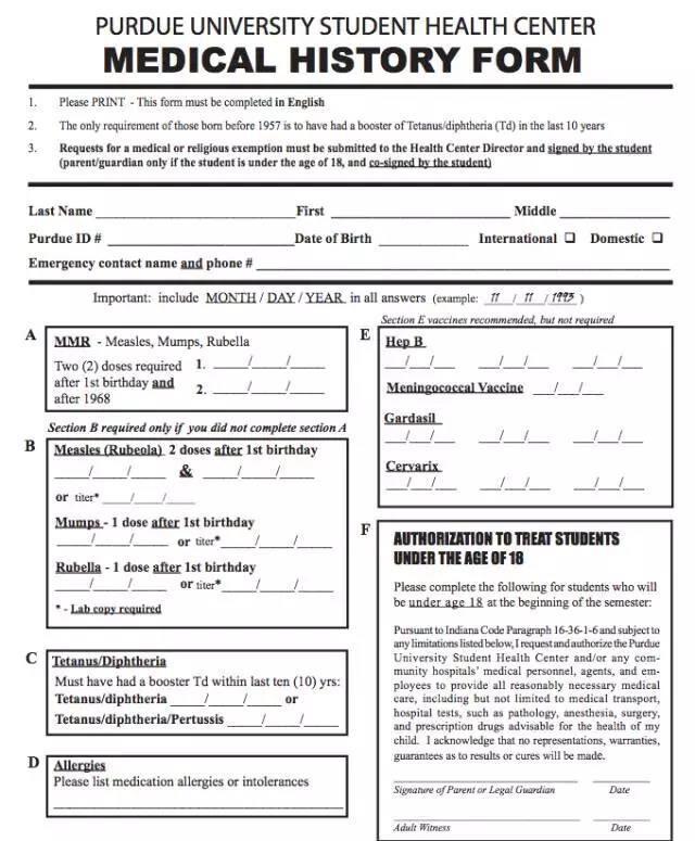 一般来说,美国学校会对留学生赴美前需要注射的疫苗有明确的规定,并以一个表格的形式呈现,即Immunization Requirement (学校要求必须注射那些疫苗),或者是Medical History Form(你的疫苗注册记录)。