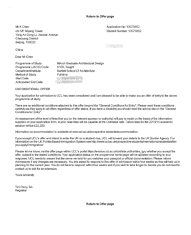 陈同学找到我的时候,已经是2016年的3月份,对于他本人的挑战是在1个月内做完成熟的作品集,对于我的挑战是在2周内递出申请,在申请的尾声阶段帮助他拿到世界建筑顶级名校AA和UCL的录取通知书。这个阶段的申请特点是:学校注重优秀的申请者和位子查漏补缺的时间段。因此,陈同学的申请材料需要特别充分和完善,首先:个人陈述的个性化,既要体现个人在建筑专业的基本功,同时要体现学生在工作中积累的经验后对建筑理念的独到见解,明晰的职业规划也是不可或缺的。作品集中需要体现作品的完整性、作品的成形过程、作品集英文注释的准确表达,这些都是申请英国建筑名校缺一不可的要素。