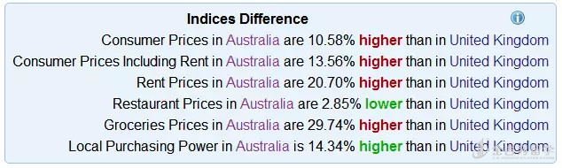 但综合看英国和澳大利亚两个国家的生活成本,澳洲甚至还比英国要高。可见城市和城市间的差异还是比较大的。