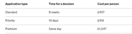 在申请签证时,你可以选择Standard,Premium以及Priority service。这几种签证的不同点主要在于签证受理的时间上,如下图: