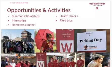 金牌认证多Multiple Accreditation拥有双认证,就业走遍全澳大利亚。 1, The Australian Nursing and Midwifery Council (ANMAC) 澳大利亚护理和助产士协会认证 2, the Nurses and Midwives Board NSW新南威尔士州护理和助产士协会认证医疗大区 Largest Health Precincts 西悉尼大学地处大西悉尼区域,占据全澳第三大CBD-帕拉马塔市(Parramatta),未来25年内全悉尼近二分之一的人口居住在大西悉尼区。据德勤的数据,此区域医疗类岗位超六万,尤其是大西区的Westmead, 是国际公认的卓越医疗研究中心,也是新南威尔士州最大的卫生专区。 智能课程Smart Curriculum 英文辅助课程 这类课程帮助护理学生更好提高英文能力,应付日后注册护士所需的英文考试。 临床技术提高课程 西悉尼大学的Parramatta, Hawkesbury, Campbelltown校区均设置价值约100多万澳元的同步模拟病房控制室,以协助学生更真实了解各种临床手术室状况,并精准指导学生如何进行操作。 就业多样化Multiple Jobs 西悉尼大学的护理学生,除了临床实习和上课之外,还有很多机会和活动增加见闻和行业认知。如下图,夏季奖学金项目,体检实习,海外实地考察,帮助流浪者义工活动等等。