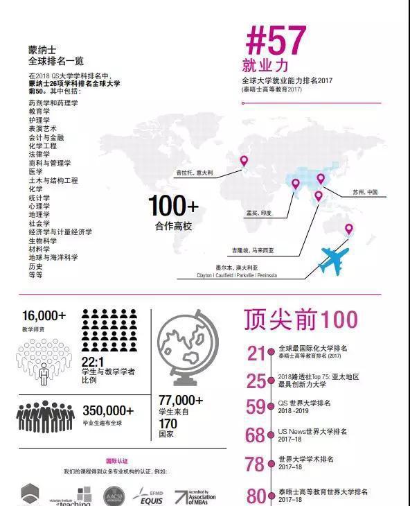 在最新发布的2019QS世界大学综合排名中,蒙纳士大学位列世界第59名。这所久负盛名的世界名校,一直保持着卓越的教学质量与科研成果,多次被评为毕业生最受雇主青睐的澳大利亚大学之一。