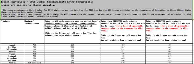 下面给大家列举一下莫纳什大学2018年审理组依据2017年高考成绩做的评定