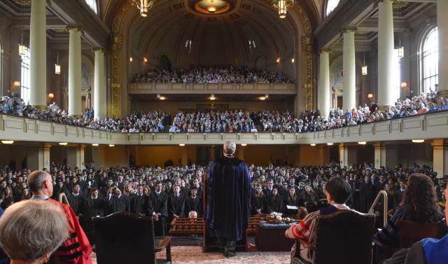 2018届的毕业生们,家长们和朋友们,很高兴与大家共同见证这个特别的日子。今天是喜悦的一天,未来则充满希望。现在,我将履行耶鲁大学光荣的传统:请在座的所有家长和朋友们起立,向我们2018届优秀的毕业生们致意;也请在座的2018届学子们起立,向所有成就你们达成今日里程碑的人们致敬。谢谢大家!
