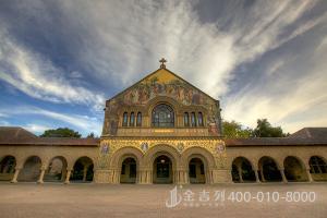斯坦福大学的楼房都是黄砖红瓦,四平八稳,一律是十七世纪西班牙的传道堂式。进入大学,首先看到的是土黄色石墙环绕下的红屋顶建筑,拱廊相接, 棕枷成行,在古典与现代的交映中充满了浓浓的文化和学术气息。