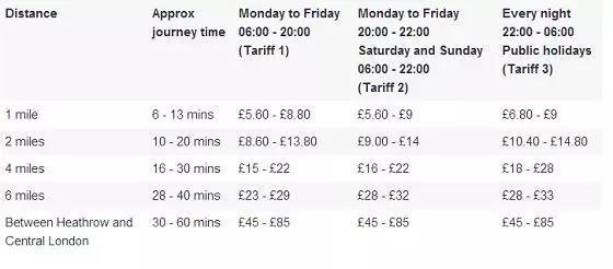 一个周末的中小型轿车租费在£70-80之间;出租车收费请看下图,三个字形容就是: 贵贵贵!嗯……起步价最低有£2.40,15分钟车程至少10镑吧~