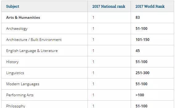 UCD的艺术人文学科综合排名世界第83位,同时这一门类下包含了排名世界第45位的英语语言与文学,另外还有其他4个强势进入世界排名前100的学科,它们分别是:考古学、历史学、现代语言学及哲学。