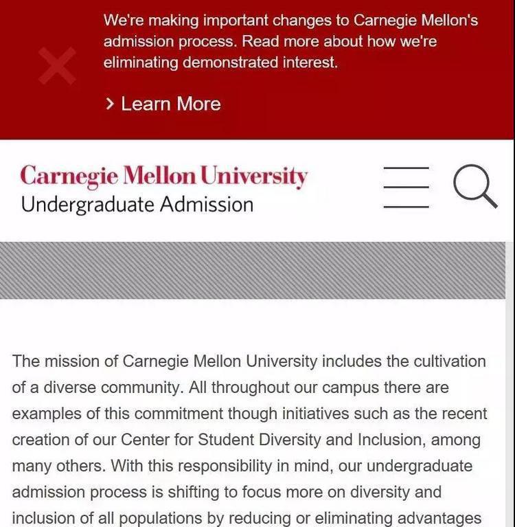 近期,Carnegie Mellon University卡耐基梅隆大学本科招生网站发出了一页标题为Eliminating Demonstrated Interest的内容,宣布申请者将可以不再提交学生简历、研究论文、作品集等补充资料,如此一来,CMU的申请流程看似省去了不少环节......