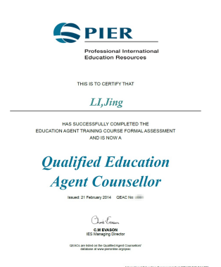 2014年2月获得澳洲政府教育中心(AEI)颁发的澳大利亚留学咨询顾问资质证书(QEAC),此证书可以在全球任何国家从事澳洲留学咨询顾问